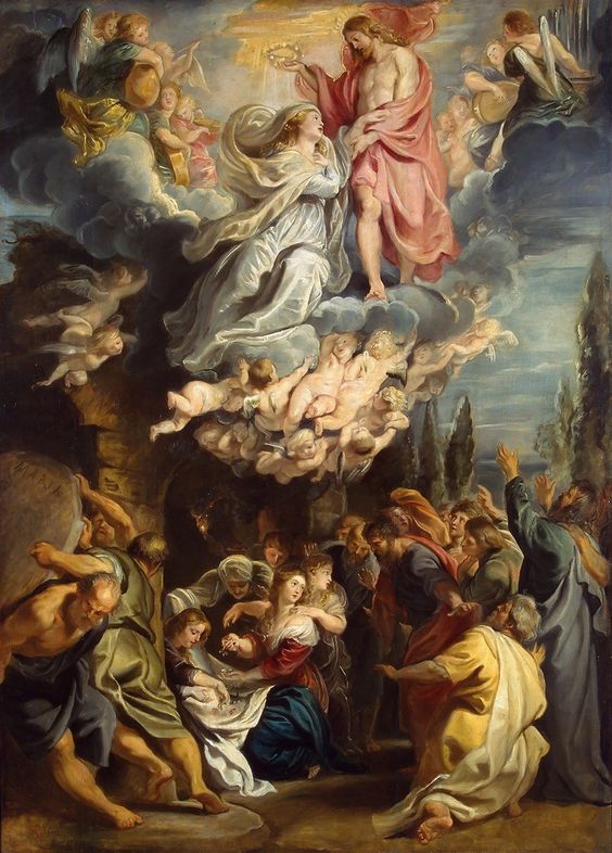 Jak stare podanie niesie, trzeciego dnia po zejściu Najświętszej Panny Maryi otworzyli Apostołowie Jej grób, lecz nic nie znaleźli, prócz kwiatów i białej chusty; już bowiem Maryja z duszą i z ciałem opuściła tę ziemię, by zasiąść na tronie niebieskim. Ku tej to Królowej podnieśmy teraz dusze nasze i przypatrzmy się, jaką jest Jej chwała w Niebie i na ziemi.