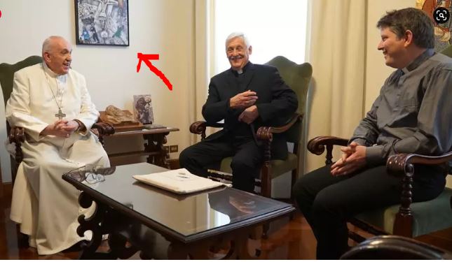Na zdjęciu ulubiony obraz Franciszka , który jest zawieszony w sali konferencyjnej jego mieszkania w Domu św. Marty znajduje się na nim talmudyczny akronim YESHU dla Jezusa Chrystusa, który oznacza „niech jego imię i jego pamięć zostaną wymazane”.