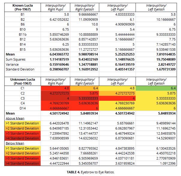 Poniższe proporcje mierzą odległość od (1) dolnej części brwi do środka źrenicy i (2) dolnej części brwi do górnej części rzęsy. Brwi Łucji I znajdują się bliżej oczu w porównaniu do starszej Łucji II, co jest sprzeczne z procesem starzenia.