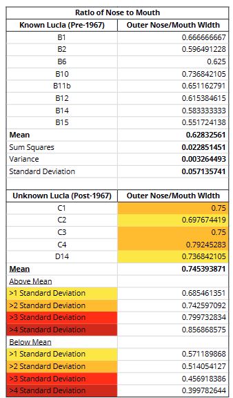 Tabela dotyczy stosunku szerokości nosa do ust. Pierwsza część tabeli dotyczy Łucji znanej sprzed roku 1967, druga Łucji po 1967.