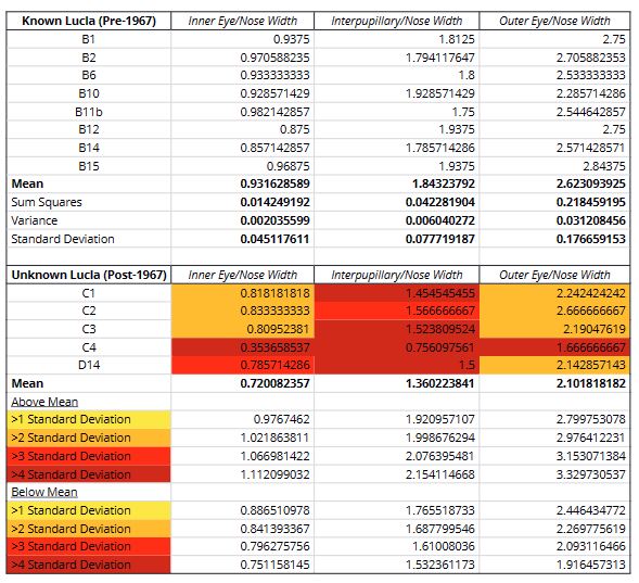 W szczególności, rzeczywista odległość między źrenicami pacjenta (odległość pozioma między punktami środkowymi każdej źrenicy) może zostać porównana z odległością między źrenicami zmierzoną na zdjęciu całej twarzy; stosunek może zostać obliczony, a następnie wykorzystany do określenia rozmiaru zęba zastępczego na podstawie względnego rozmiaru własnego zęba pacjenta przedstawionego na zdjęciu. Na przykład, jeśli stare zdjęcie pacjenta pokazuje odległość między źrenicami wynoszącą 10 mm i szerokość zęba wynoszącą 1 mm, uzyskany zostanie stosunek 10:1. Stosunek 10:1 można po prostu zapisać jako 10. Na tej podstawie lekarz zmierzyłby odległość między źrenicami pacjenta na żywo, a jeśli odległość ta wynosiłaby 50 mm, wówczas lekarz mógłby zastosować stosunek 10:1 i stwierdzić, że potrzebny brakujący ząb powinien mieć szerokość 5 mm. Z pomocą protetyka, Sister Lucy Truth zastosowała te zasady pomiaru do kolekcji zdjęć całej twarzy znanej Łucji I i oszustki Łucji II. Poniższe dane pokazują różne proporcje udokumentowane przy użyciu różnych anatomicznych cech twarzy. Jak wspomniano, dane zdecydowanie potwierdzają wniosek, że Łucja I i Łucja II to różne osoby, biorąc pod uwagę różne długości philtrum, szerokości nosa, odległości między brwiami i znaczące różnice między różnymi proporcjami.