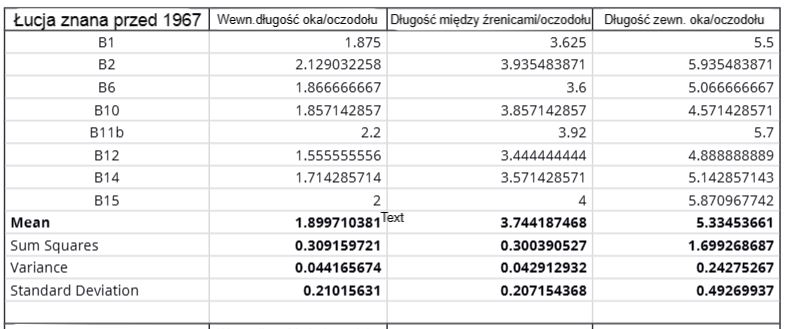 [Pierwsza część tabeli dotyczy Łucji znanej sprzed roku 1967, druga Łucji po 1967 – Rubryki wskazują odpowiednio: wewnętrzną długość oka/oczodołu -długość między źrenicami/oczodołu -długość zewnętrzną oka/oczodołu – przypis red.]