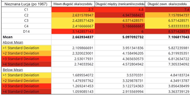 • Czerwony współczynnik jest o ponad 3 odchylenia standardowe wyższy od oczekiwanego współczynnika u autentycznej Łucji – 99,7% współczynników powinno mieścić się w 3 odchyleniach standardowych
