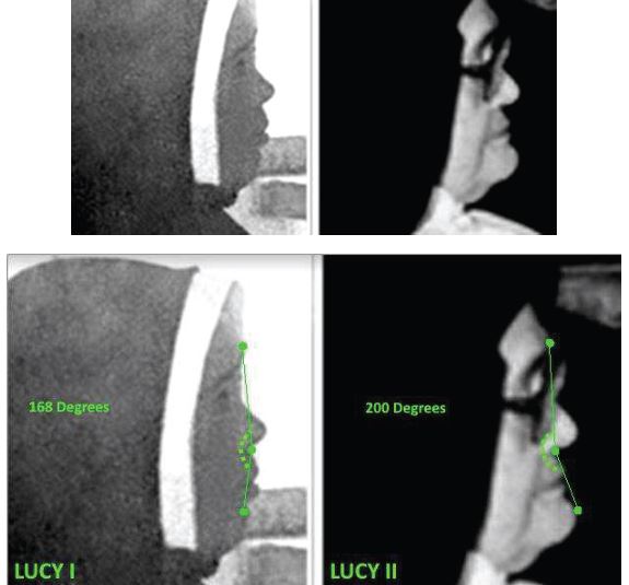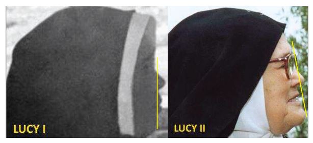 Jednak podbródekŁucji I jest zagłębiony w stosunku do czubka nosa. Najbardziej przednia część podbródka Łucji I jest pionowo wyrównana do miejsca za jej nozdrzem. Obrazy tej fizycznej rozbieżności znajdują się poniżej: