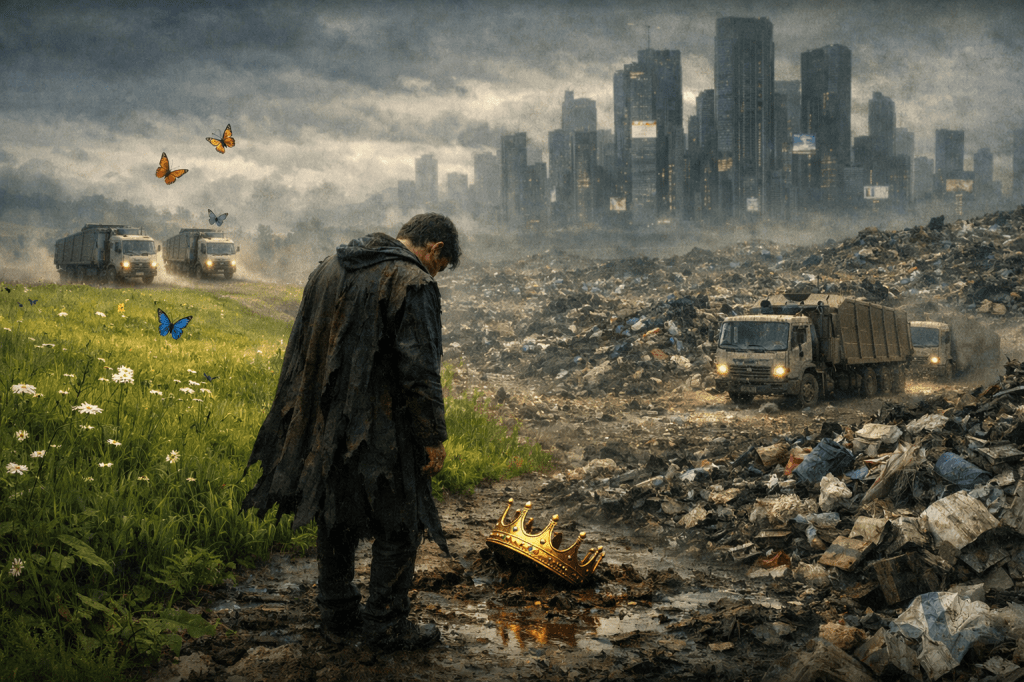 Jak piękne motyle fruwamy na słonecznej, zielonej łące, wiedząc, że przeznaczona jest ona na wysypisko śmieci. Nic nie robimy, udajemy, że to kłamstwo, aż przyjeżdżają śmieciarki, wysypując na nas tony śmieci świata, pogrzebując nasze przeznaczenie — może już na zawsze.
